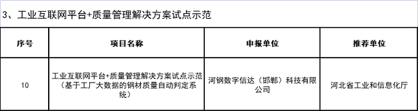 2月18日,工业和信息化部发布“2021年工业互联网试点示范项目名单”,南京钢铁、上海宝信软件、德龙钢铁、河钢数字信达(邯郸)科技、中天钢铁集团、中冶赛迪等企业申报的6个钢铁相关项目入选。详情如下: